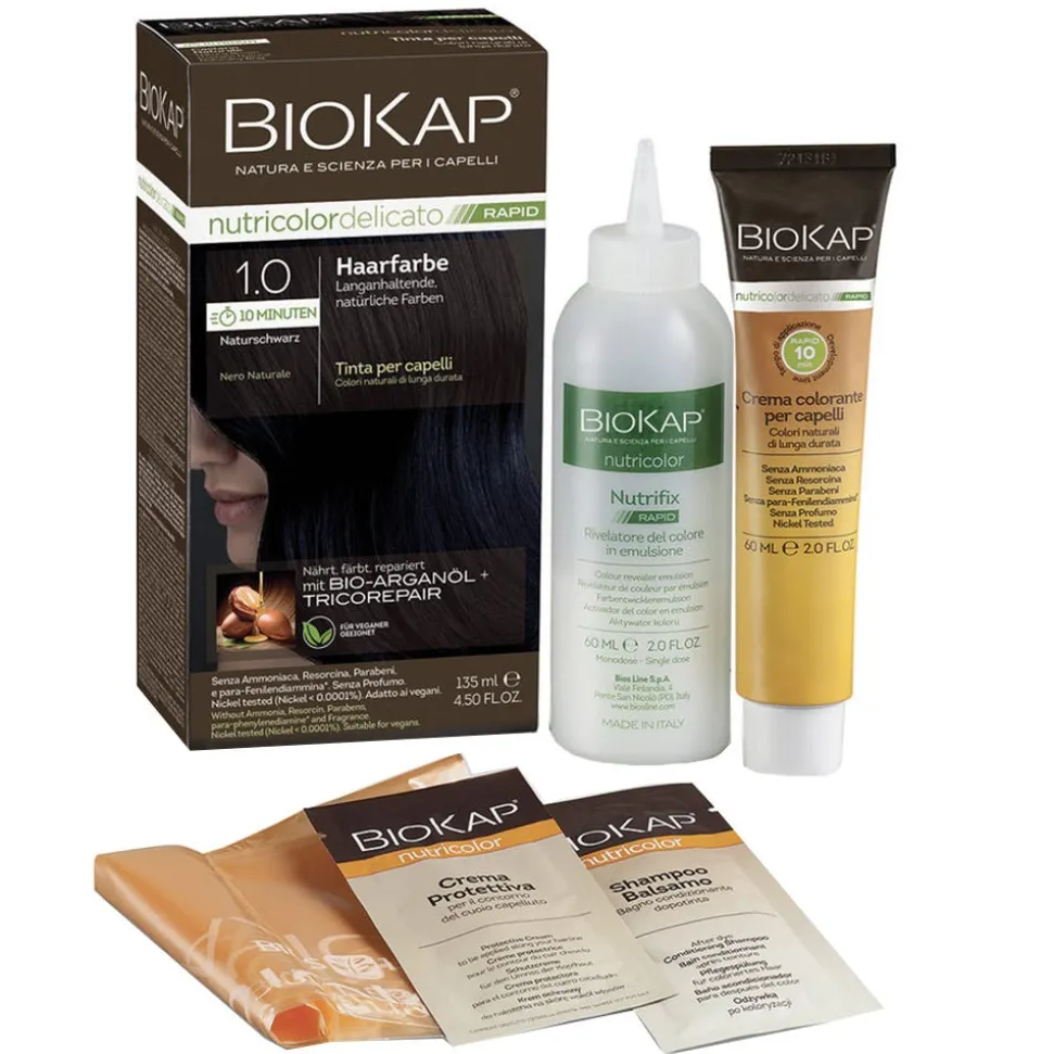 Die BIOKAP Haarfarbe Nutricolor Delicato Rapid Naturschwarz 1.0 ist eine sehr Langanhaltende und natürliche Farbe, welche deinem Haar den natural Look verleiht.