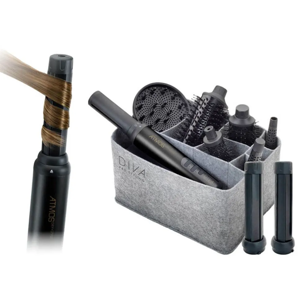 Der Diva Atmos Dry & Style Hairstyler inkl. Auto Aircurl ist ein Haartrockner und Styler in einem Gerät. Er verfügt über einen Gleichstrommotor mit 100.000 U/min., der weniger Energie verbraucht und 10x länger hält. Der Atmos Energie Motor wiegt nur ein Viertel von dem Gewicht eines regulären Föhns mit AC-Motor und ist deutlich leiser.