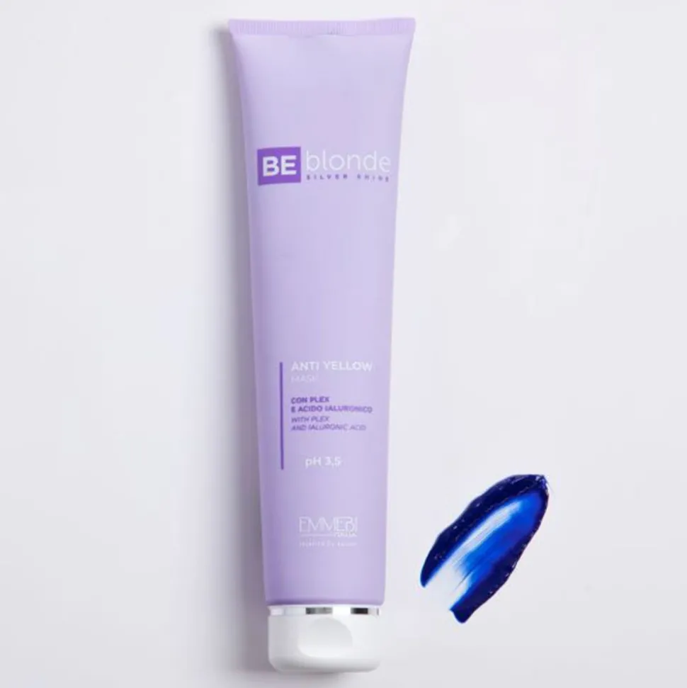DieEMMEBI BE blonde Anti Yellow Mask ist eineAnti-Gelb-Restrukturierungsbehandlung für blondes, gebleichtes oder graues Haar mit Plex, Hyaluronsäure und Kollagen. Die mit einem hohen Anteil an violetten Pigmenten angereicherte Formel mit intensiver Wirkung nährt, schützt, entwirrt und erhellt das blonde Haar, neutralisiert die unerwünschte gelbe Reflexion und stellt weiches und sichtbar restrukturiertes Haar wieder her.