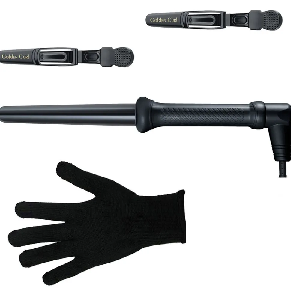 DerGolden Curl Lockenstab (Schwarz)ist ein Keramik Turmalin beschichteter Lockenstab mit 18 mm – 25 mm Durchmesser für mittlere bis große Locken und einen atemberaubenden Beach Waves Look wie vom Friseur. Haarschonendes Styling dank der fortgeschrittenen Inonen Technologie. DieLockenstäbe heizen ultra schnell auf bis zu200°C und kommen mit professionellem Zubehör für optimale Handhabung und ein einzigartiges Styling Erlebnis. Für bequeme Handhabung für Heimanwender und Haarytlisten. Der Lockenstab kommt mit einem Hitzehandschuh undKroko Clips Abteilklammern.