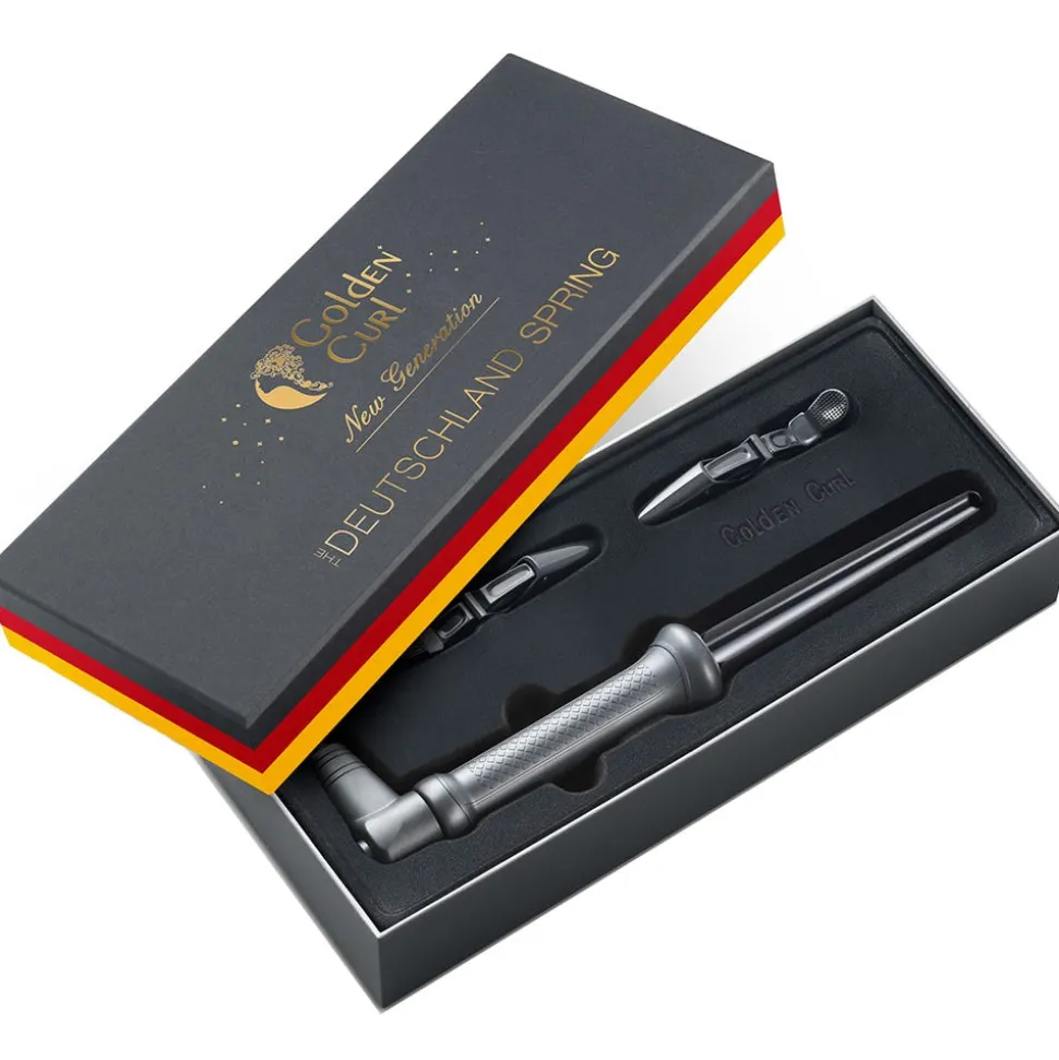DerGolden Curl Spring Lockenstab (Deutschland)ist ein Keramik Turmalin beschichteter Lockenstab mit 18 mm – 25 mm Durchmesser für mittlere bis große Locken und einen atemberaubenden Beach Waves Look wie vom Friseur. Haarschonendes Styling dank der fortgeschrittenen Inonen Technologie. DieLockenstäbe heizen ultra schnell auf bis zu200°C und kommen mit professionellem Zubehör für optimale Handhabung und ein einzigartiges Styling Erlebnis. Für bequeme Handhabung für Heimanwender und Haarytlisten. Der Lockenstab kommt mit einem Hitzehandschuh und 2 Kroko Clips Abteilklammern.