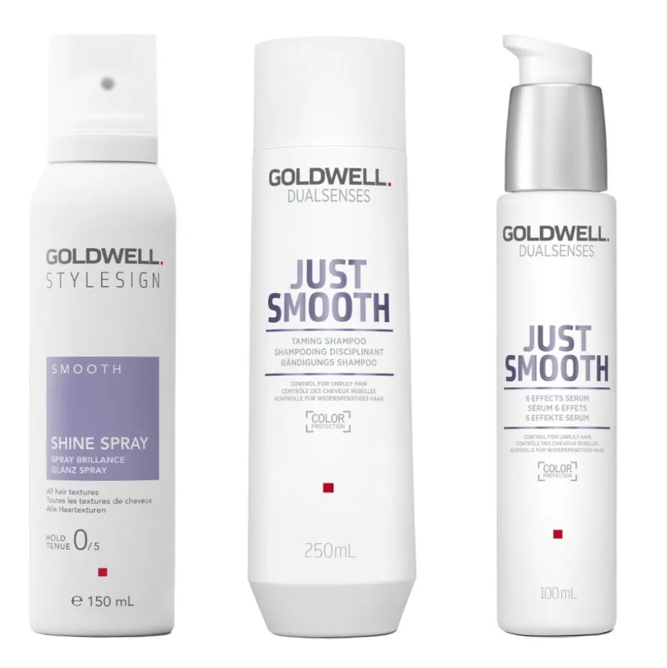 Das Goldwell Dualsenses & Stylesign Glanz Bundle enthält Pflege- & Stylingprodukte für seidig glänzendes Haar. Enthalten ist das Goldwell Stylesign Smooth Glanz-Spray 150 ml, das Goldwell Dualsenses Just Smooth Taming Shampoo 250 ml und Goldwell Dualsenses Just Smooth 6 Effects Serum 100 ml.