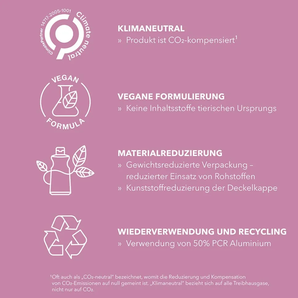 | Besonderheit | Dermatologisch getestet, Frei von Mineralöl, Keine tierischen Inhaltsstoffe, Silikonfrei, Sulfatfrei, Umweltfreundlich, Vegan |