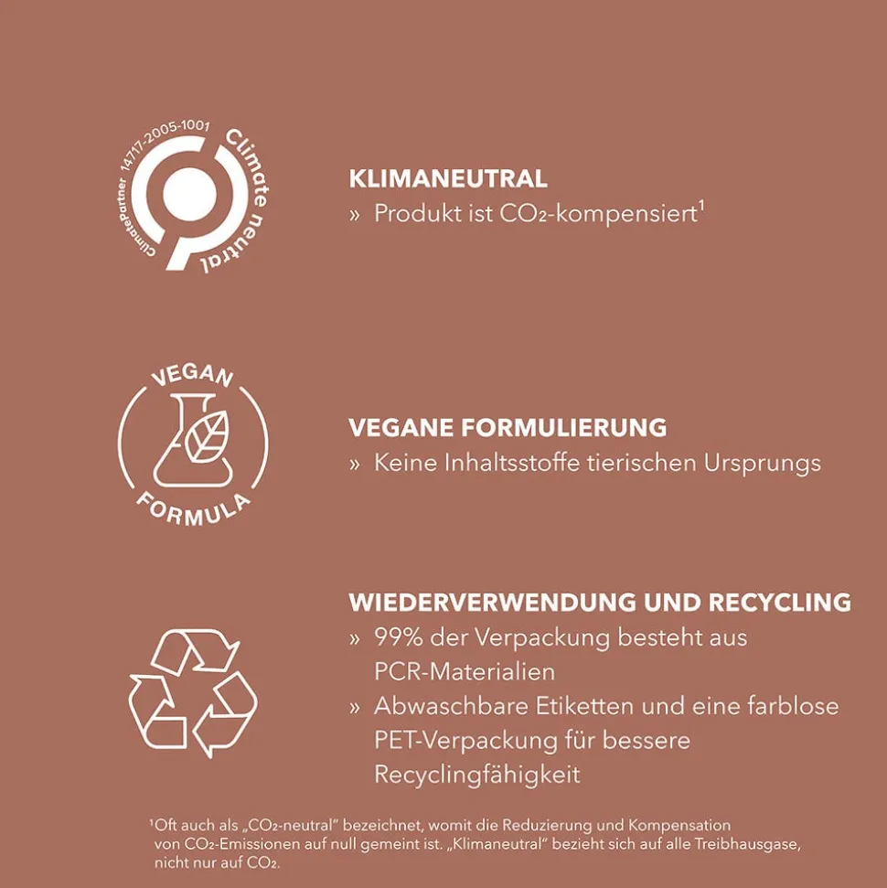 | Besonderheit | Dermatologisch getestet, Frei von Mineralöl, Keine tierischen Inhaltsstoffe, Silikonfrei, Umweltfreundlich, Vegan |
