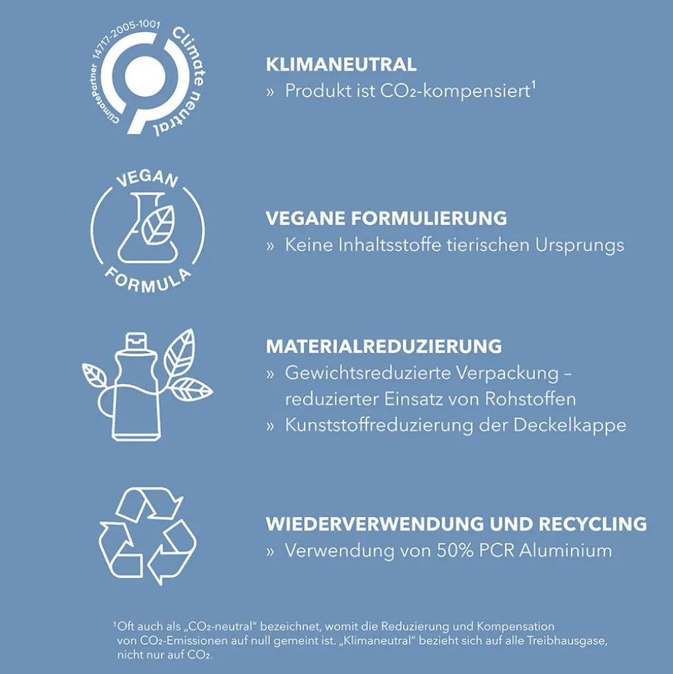 | Besonderheit | Dermatologisch getestet, Frei von Mineralöl, Keine tierischen Inhaltsstoffe, Ohne Alkohol, Sulfatfrei, Umweltfreundlich, Vegan |
