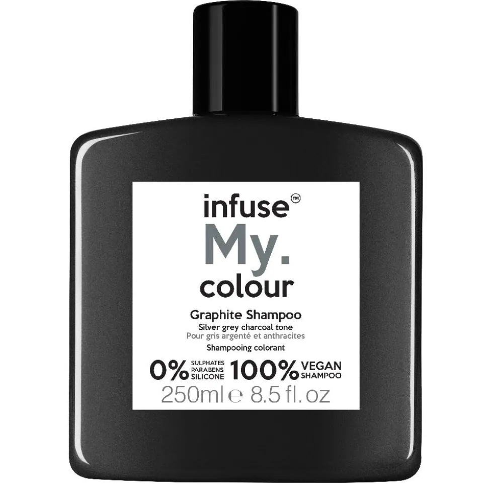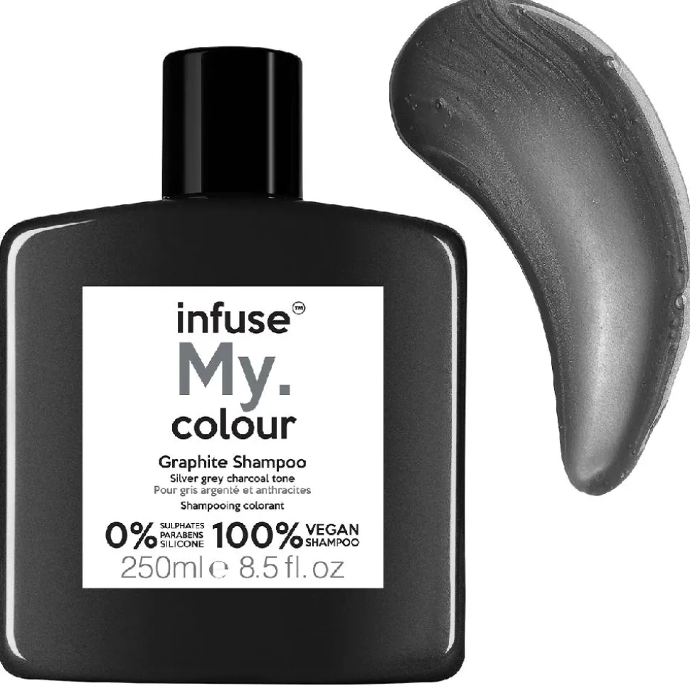 DasInfuse My. Graphite Gold Shampooverleiht dem Haar einen silber/grauen Farbton. Wie ein Farbfilter auf hellem Haar. Kühlt dunke Haartöne ab. Schwarz-violett-blauer Unterton.