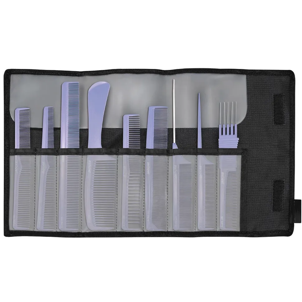 Der Jaguar Kamm-Set A-Line Lavender aus der professionellen ionische Kammlinie aus hochwertigem Kunststoff bestehend aus 9 verschiedenen ModellenIonen helfen dem Haar Feuchtigkeit aufzunehmen und geben ihm einen gesunden und gepflegtenGlanz. Zusätzliche Verrundungen der Zähne schonen Haare und Kopfhaut.Alle Modelle sind anti-statisch, resistent gegen Hitze und Chemikalien.