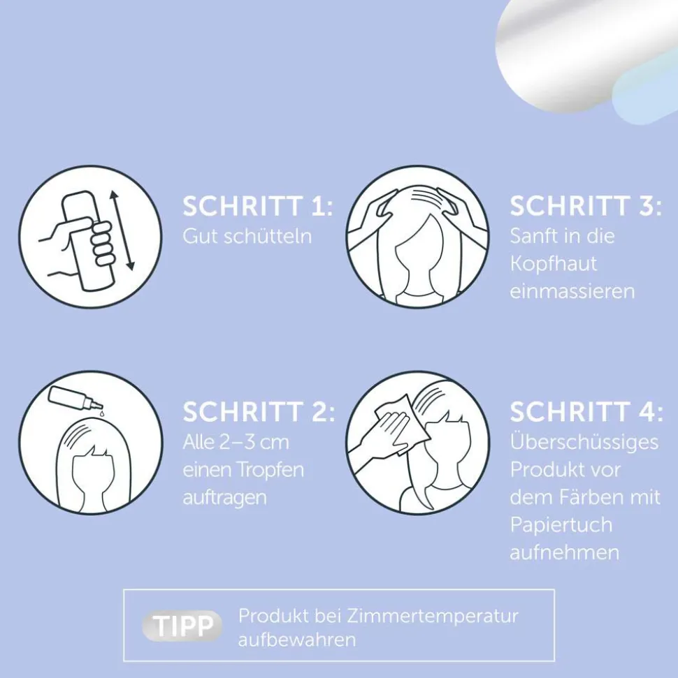 Gut schütteln. Auf der gesamten Kopfhaut alle 2–3 cmeinen Tropfen auftragen und sanft einmassieren. Insgesamt nicht mehrals 5 ml verwenden. Überschüssiges Produkt vor dem Färben mit Papiertuch aufnehmen, kein Föhnen erforderlich. Färben wie gewohnt.Produkt bei Zimmertemperatur aufbewahren.