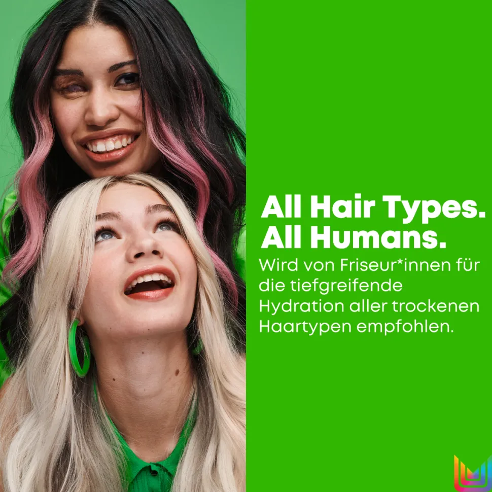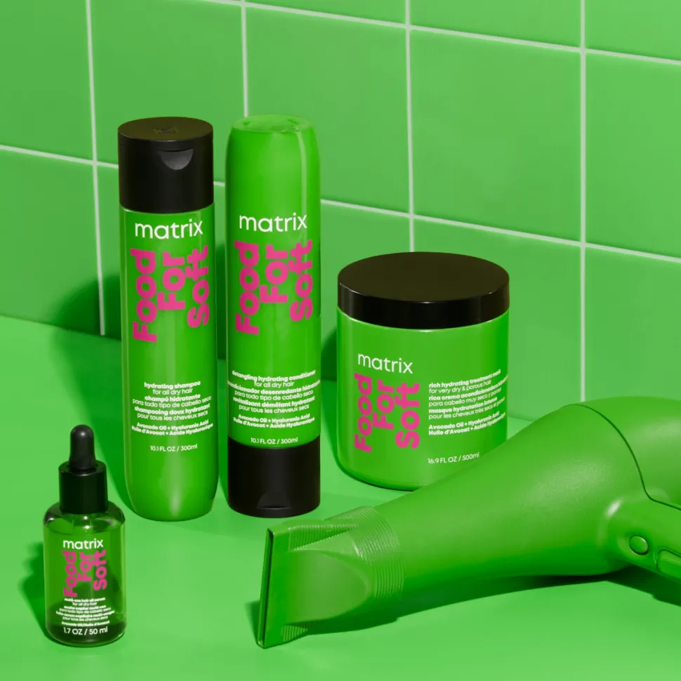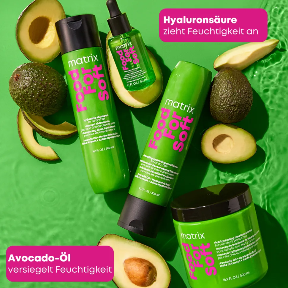 DerMatrix Food for Soft Conditioner ist ein entwirrender, feuchtigkeitsspendender Conditioner für alle trockenen Haartypen. Erenthält Avocado-Öl und Hyaluronsäure. Dabei hilft die Hyaluronsäure Feuchtigkeit aufzunehmend wie ein Schwamm, während das Avocado-Öl diese im Haar versiegelt. So spendet der Conditioner intensive Feuchtigkeit und sorgt für weiches und gepflegtes Haar. Die Formel des Conditioners ist frei von Inhaltsstoffen tierischen Ursprung und somit vegan.
