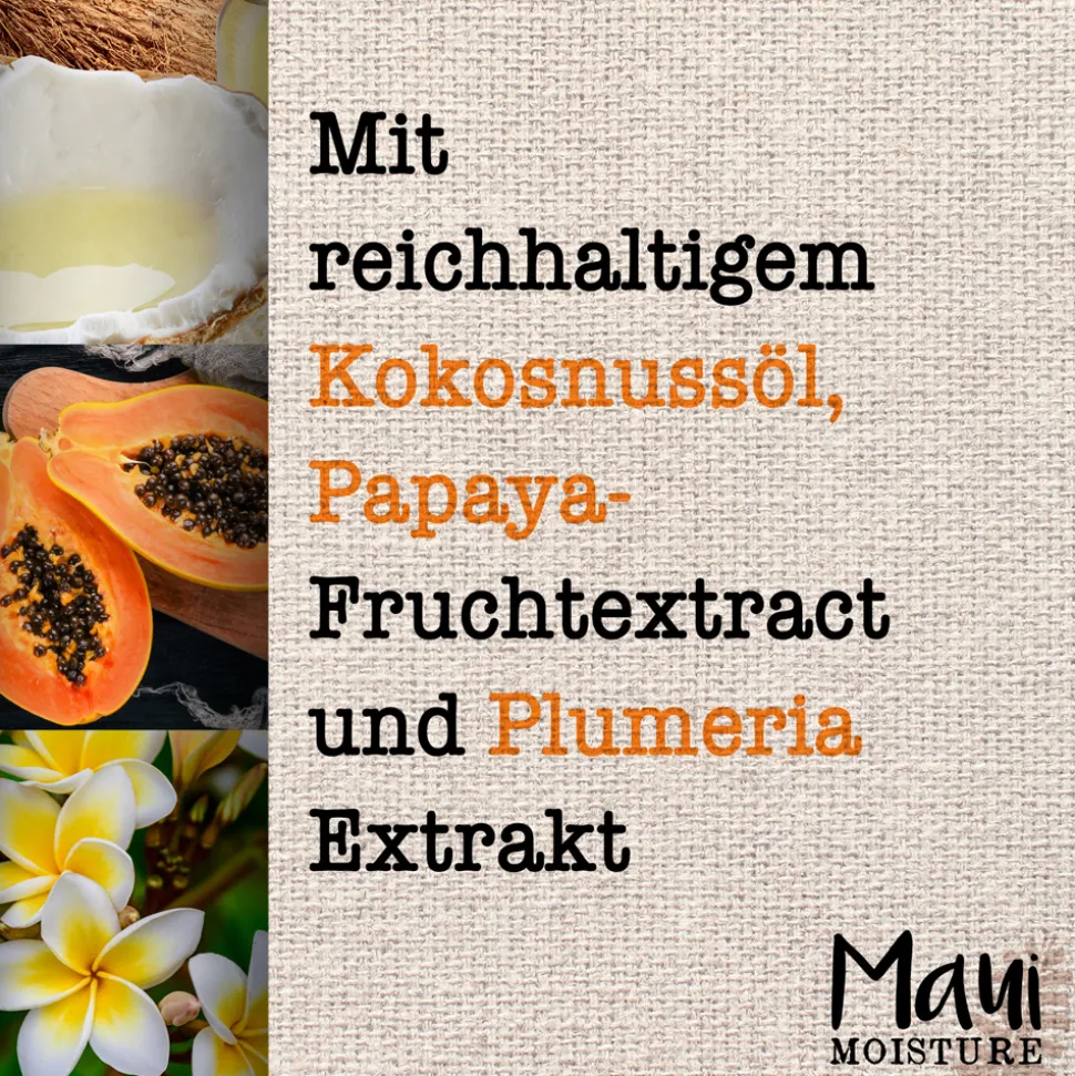 | Inhaltsstoffe | Aloe Barbadensis Leaf Juice, Aqua, Water, Eau, Cetearyl Alcohol, Behentrimonium Chloride, Cetyl Alcohol, Glycerin, Isostearyl Hydroxystearate, Cocos Nucifera (Coconut) Water, Cocos Nucifera (Coconut) Oil, Carica Papaya (Papaya) Fruit Extract, Plumeria Alba Flower Extract, Panthenol, Polyquaternium-10, Polyquaternium-37, Stearamidopropyl Dimethylamine, Steareth-20, Dicaprylyl Carbonate, Propylene Glycol Dicaprylate, Dicaprate, PPG-1 Trideceth-6, Acrylates Copolymer, Sorbitan Oleate, Isopropyl Alcohol, Isopropyl Myristate, Citric Acid, Sodium Hydroxide, Sodium Benzoate, Glycine Soja (Soybean) Oil, Phenoxyethanol, Tocopherol, Salicylic Acid, Sorbic Acid, Benzyl Alcohol, Leuconostoc, Radish Root Ferment Filtrate, Parfum, Fragrance, Limonene, Coumarin |