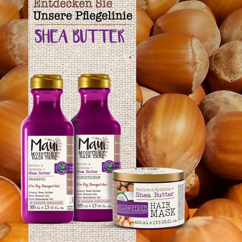 DieMaui Moisture Revive & Hydrate Shea Butter Mask ist ein Traum für jeden mit trockenem, geschädigtem oder überstyltem Haar. Diese Haarmaske spendet intentive Feuchtigkeit und speichert sie im Haar. Die Formel mit Shea-Butter, Kokosnuss-Öl und Macadamia-Öl macht geschmeidig, hydratisiert und revitalisiert. Bei besonders trockenem Haar kann diese tiefenwirksame Pflege ohne Ausspülen auf dem nassen Haar verbleiben.