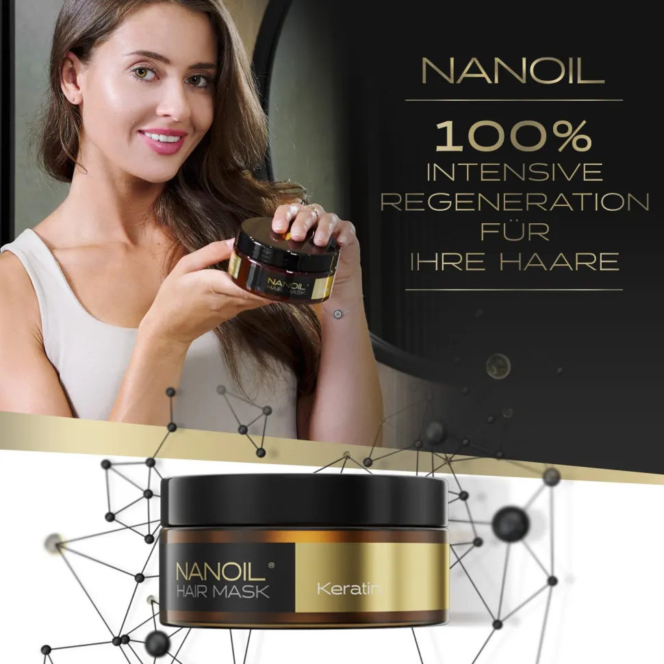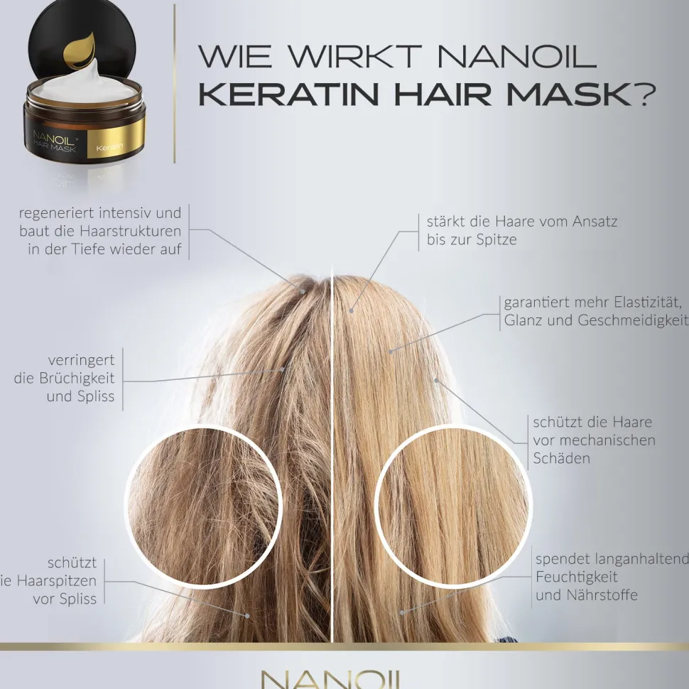 DieNanoil Keratin Hair Mask ist eineregenerierende Haarmaske mit Keratin für jeden Haartyp – auch für trockene, geschädigte, geschwächte Haare, die eine spezielle Pflege erfordern. Sie verleiht den Glanz sogar sehr geschwächten und geschädigten Haaren, stärkt sie und betont ihre Schönheit. Die Haarmaske mit Keratin sichert schnelle Effekte innerhalb kurzer Zeit, was bewirkt, dass der Zustand der Haare sich verbessert und die Haare schön wie nie zuvor sind.