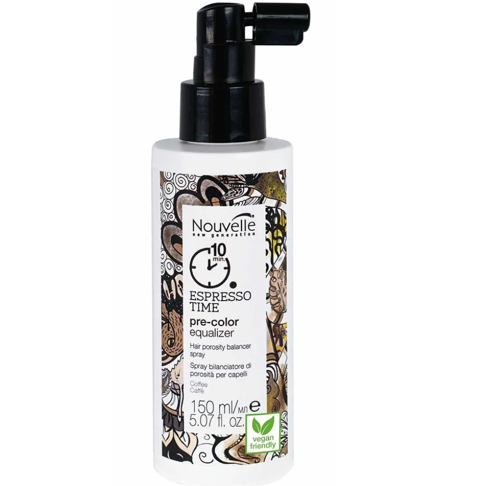 DerNouvelle Espressotime Pre-Color Equalizer ist einSpray zum Strukturausgleich bei porösemHaar mit saurem pH-Wert und feuchtigkeitsspendendenEigenschaften. Die pflegende Formulierung schütztgefärbtes Haar vor Farbüberlagerung.