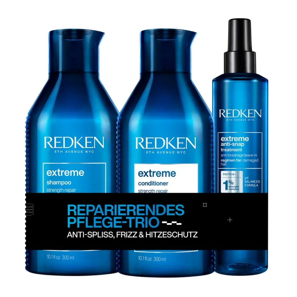 Das Redken Extreme 3er Set mit Conditioner besteht aus demRedken Extreme Shampoo 300 ml, demRedken Extreme Anti-Snap 250 ml und demRedken Extreme Conditioner 300 ml.
