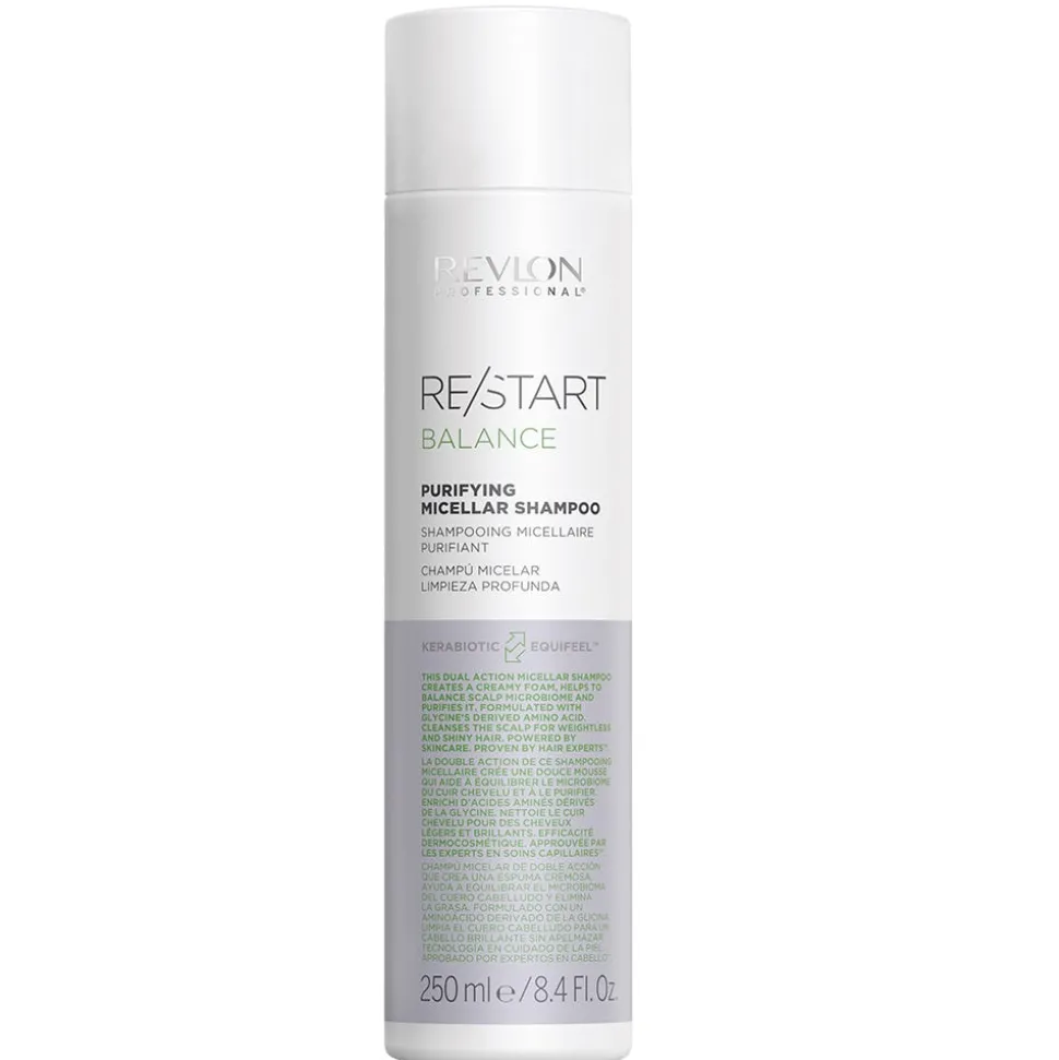 Das Revlon Re/Start Purifying Micellar Shampooerzeugt einen cremigen Schaum, hilft das Mikrobiom der Kopfhaut auszugleichen und reinigt sie. Formuliert mit der von Glycin abgeleiteten Aminosäure, reinigt das Shampoo die Kopfhaut für glänzendes, schwereloses Haar.