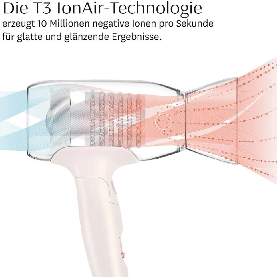 - T3 IonAir: Die fortschrittliche Luftstromtechnologie setzt Ionenreiche Luft frei, um große Haarabschnitte schnell und sanft zu trocknen