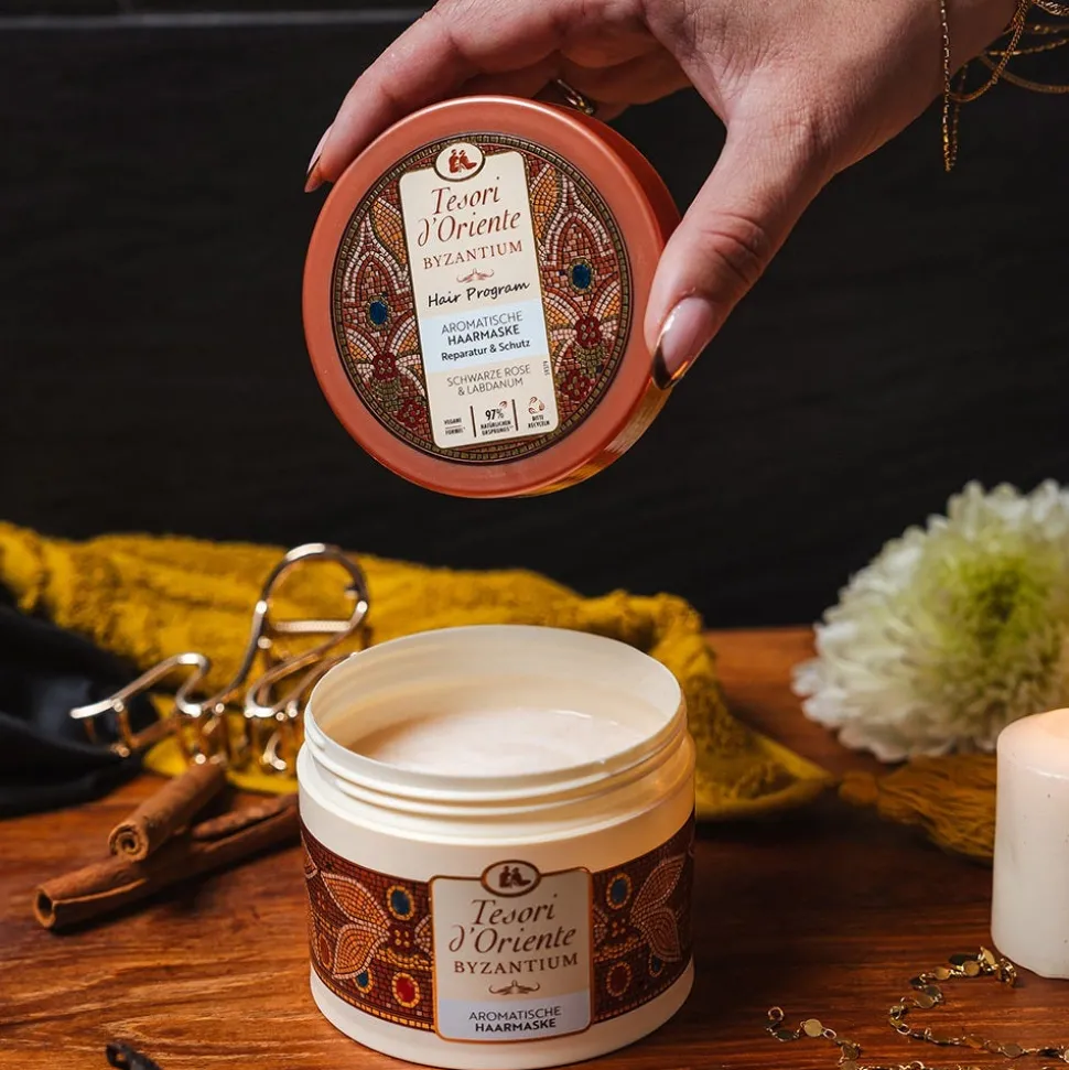 Entfliehe dem Alltag und begib dich auf eine Reise in die zauberhafte Welt des Orients! Erlebe die tiefenwirksame Pflege der Tesori d‘ Oriente aromatische Haarmaske Byzantium, inspiriert von den erlesenen Düften und dem Glanz der antiken Stadt Byzanz. Speziell entwickelt für beanspruchtes Haar, verwöhnt diese Maske mit der intensiven Kombination aus schwarzer Rose und Labdanum. Sie repariert geschädigtes Haar, spendet Feuchtigkeit und schützt vor weiteren Schäden. Die Haarmaske sorgt für seidige Geschmeidigkeit und verleiht deinem Haar einen natürlichen Glanz, während der sinnliche Duft deine Sinne in ferne, orientalische Welten entführt. Perfekt für ein luxuriöses Verwöhnritual, dass dein Haar strahlend schön und gesund aussehen lässt.