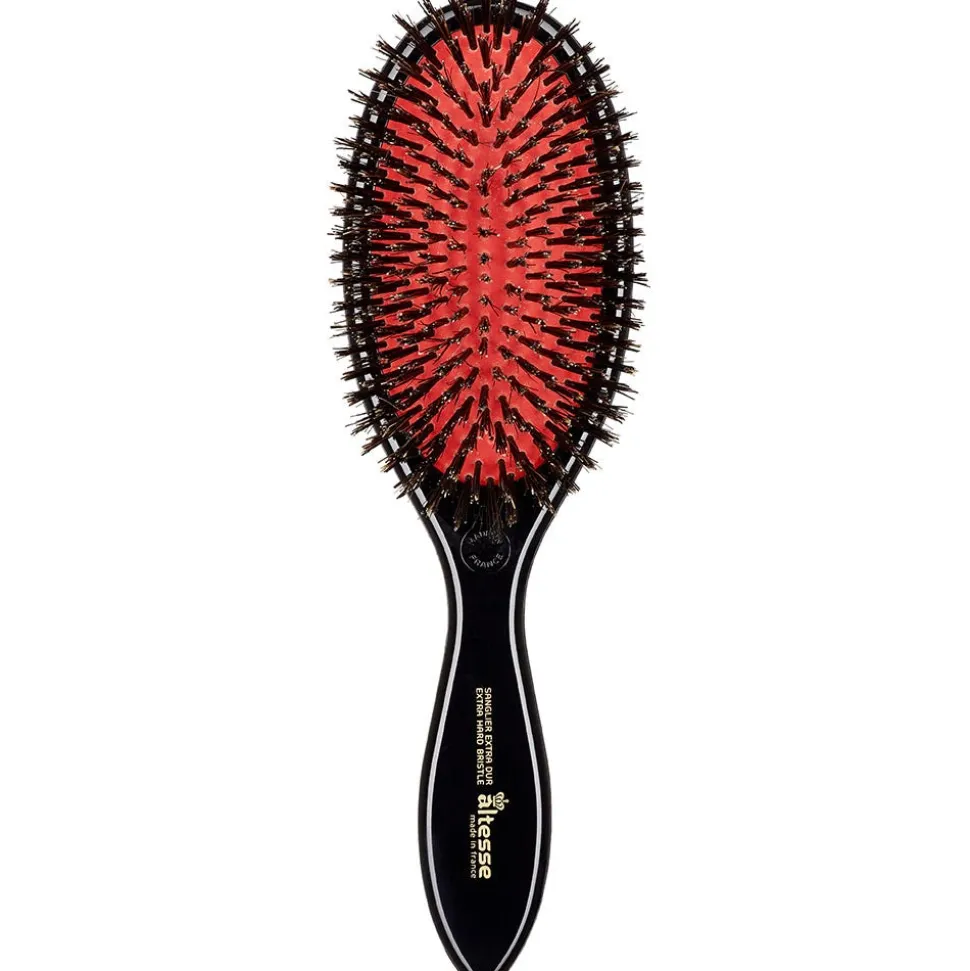 Die Altesse Bürste 2913 ist eine exklusive Pneumatikbürste von Hand gefertigt mit 100 % Wildschweinborsten und weichem Pneumatikkissen aus Latex, das den Druck auf die Kopfhaut ausgleicht.