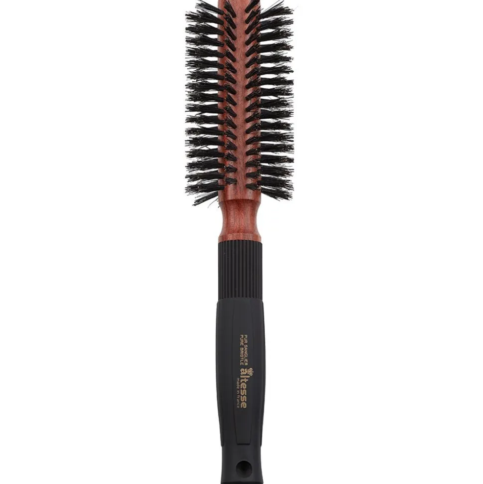 Die Altesse Rundbürste 410BR Pure Sanglier 22/58 sorgt durch ihre antistatischen Eigenschaften für weniger aufgeladene Haare. Der Bürstengriff ist ergonomisch geformt, gummiert und liegt dadurch angenehm in der Hand für entspanntes Arbeiten. Pure Sanglier ist eine besondere Rundbürsten-Serie handgefertigt aus hochwertigem Bubingaholz mit 100 % reinen Wildschweinborsten. Die natürliche Talgproduktion der Kopfhaut wird unterstützt und verleiht dem Haar ein gesundes und glänzendes Aussehen.