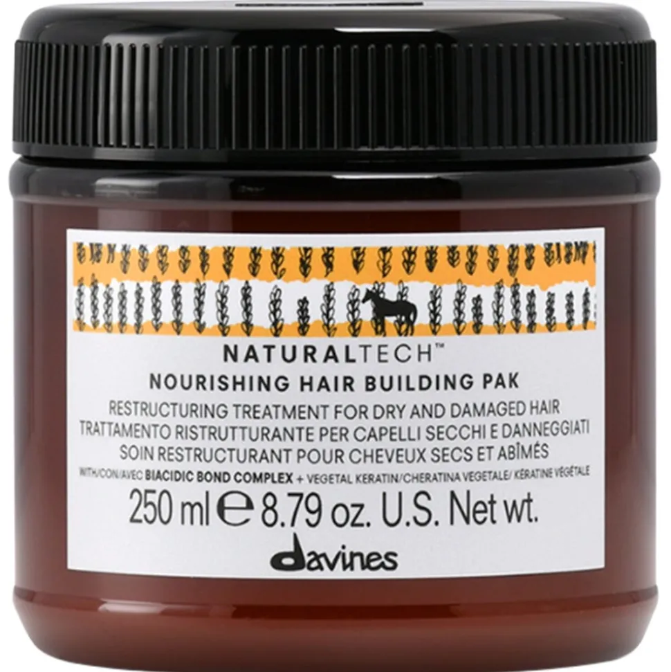 DavinesNaturaltechNourishingHairBuildingPakistein restrukturierende Pflegefür trockenes Haar. Dankdes pflanzlichenKeratins kombiniert mit Aminosäure undBiacidBondComplex, ermöglicht es trockenes und beschädigtes Haar zu Hause effektiv zu behandeln.