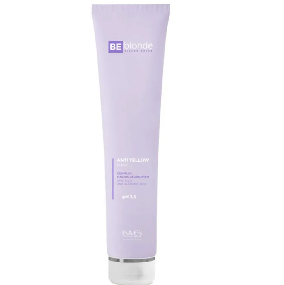 DieEMMEBI BE blonde Anti Yellow Mask ist eineAnti-Gelb-Restrukturierungsbehandlung für blondes, gebleichtes oder graues Haar mit Plex, Hyaluronsäure und Kollagen. Die mit einem hohen Anteil an violetten Pigmenten angereicherte Formel mit intensiver Wirkung nährt, schützt, entwirrt und erhellt das blonde Haar, neutralisiert die unerwünschte gelbe Reflexion und stellt weiches und sichtbar restrukturiertes Haar wieder her.