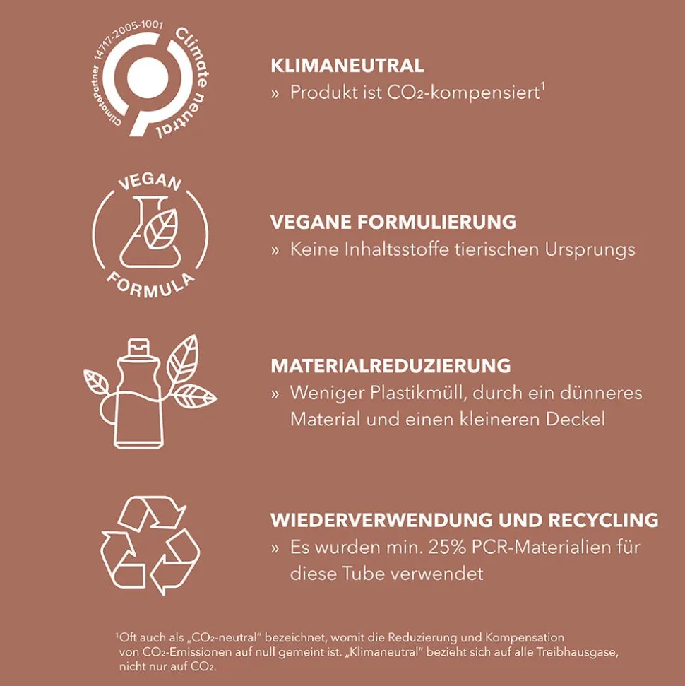 | Besonderheit | Dermatologisch getestet, Frei von Mineralöl, Keine tierischen Inhaltsstoffe, Silikonfrei, Sulfatfrei, Umweltfreundlich, Vegan |