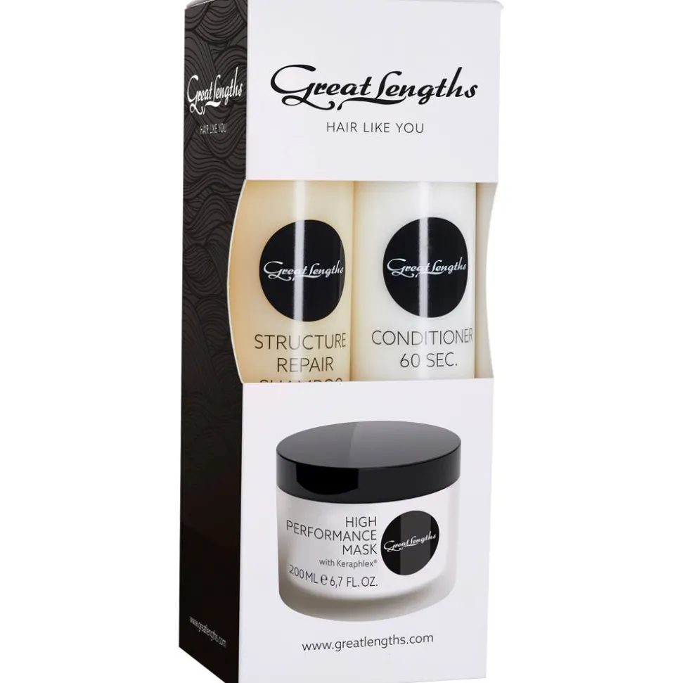 DieGreat Lengths Multibox Structure Repairist ein spezial Set für eine Nährende Pflege von feinem und strapaziertem Haar. Es enthält einGreat Lengths Structure Repair Shampoo 250 ml, einGreat Lengths 60 Sec. Conditioner 250 ml und eineGreat Lengths High Performance Mask 200 ml, plus ein Überraschungsgeschenk.