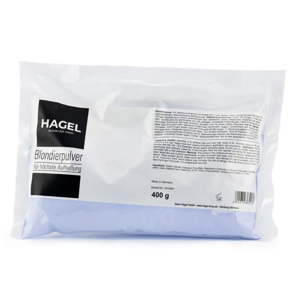DasHAGEL Blondierpulver für höchste Aufhellungvom Ansatz bis zu den Spitzen. Kein unangenehmes Stauben. Ein außergewöhnlich leistungsstarkes Blondierpulverfür Strähnen & Ganzblondierungen. Es blondiert natürliche und gefärbte Haare. Sicheres Arbeiten und gleichmäßig helles Ergebnis. Bleibt geschmeidig, läuft nicht ab und trocknet nicht ein.