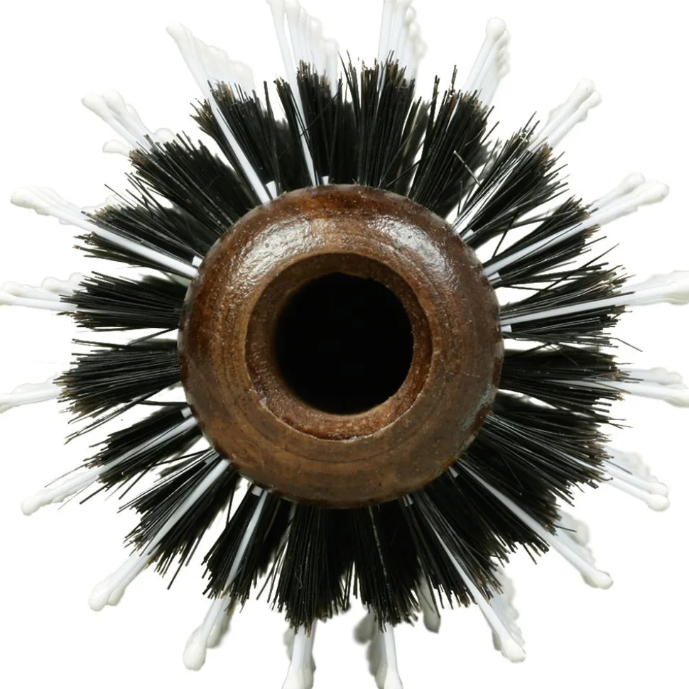 Mit reinen Wildschweinborsten und ca. 5 mm längeren hitzebeständigen Polyamidstiften besetzt zum optimalen Ordnen der Haare vor dem Eindrehen.