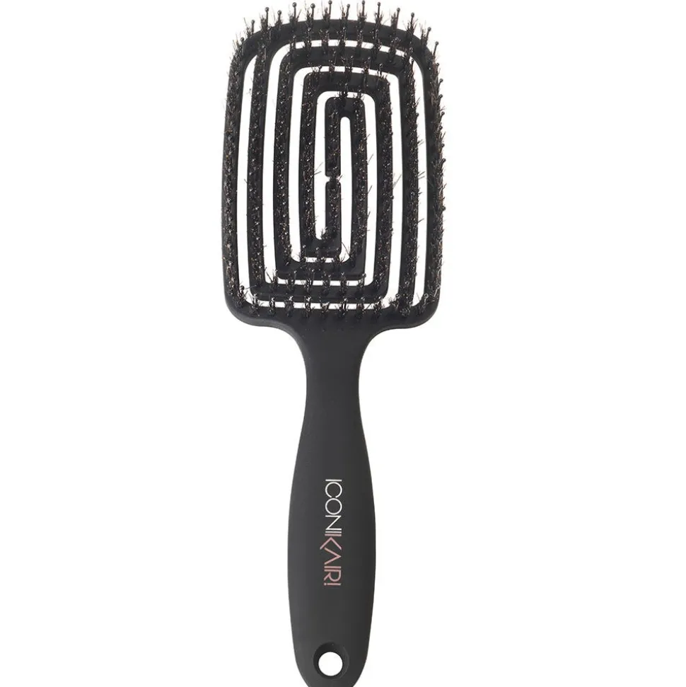 DieICONIKAIR! Blow Dry Brush Bristle ist zum Bürsten von dünnem Haar ohne Volumen geeignet. Die Bürste besteht aus Nylon- und Wildschweinborsten. Die flexible und gewölbte Form des Bürstenkopfes bietet während des Bürstens eine angenehme Kopfhautmassage, die nicht nur dazu führt, dass alle Haare von der Kopfhaut gelöst werden können, sondern auch dass die Durchblutung der Kopfhaut angeregt wird. Die langen Premium Nylonborsten und die gebogene Form, die sich der Kopfform anpasst, sorgen dafür dass die Haare an den Wurzeln erreicht werden und so schonend entwirrt werden können. Die antistatische Beschichtung der Nylonborsten verhindert ein Aufladen der Haare beim Bürsten, was zu ungewollten fliegenden Haaren führen kann. Die Bürste ist luftdurchlässig, d.h. dass sich die Luft beim Föhnen nicht in der Bürste staut, sondern auf der anderen Seite entweichen kann. Dies verringert nicht nur die Föhnzeit, sondern schont Haar und Bürste. Die Blow Dry Brush ist zudem bei gewöhnlichem Gebrauch hitzebeständig undvollständig waschbar (mit der Hand), was sie antibakteriell macht und eine Verteilung von Bakterien auf Haar und Kopfhaut verhindert.