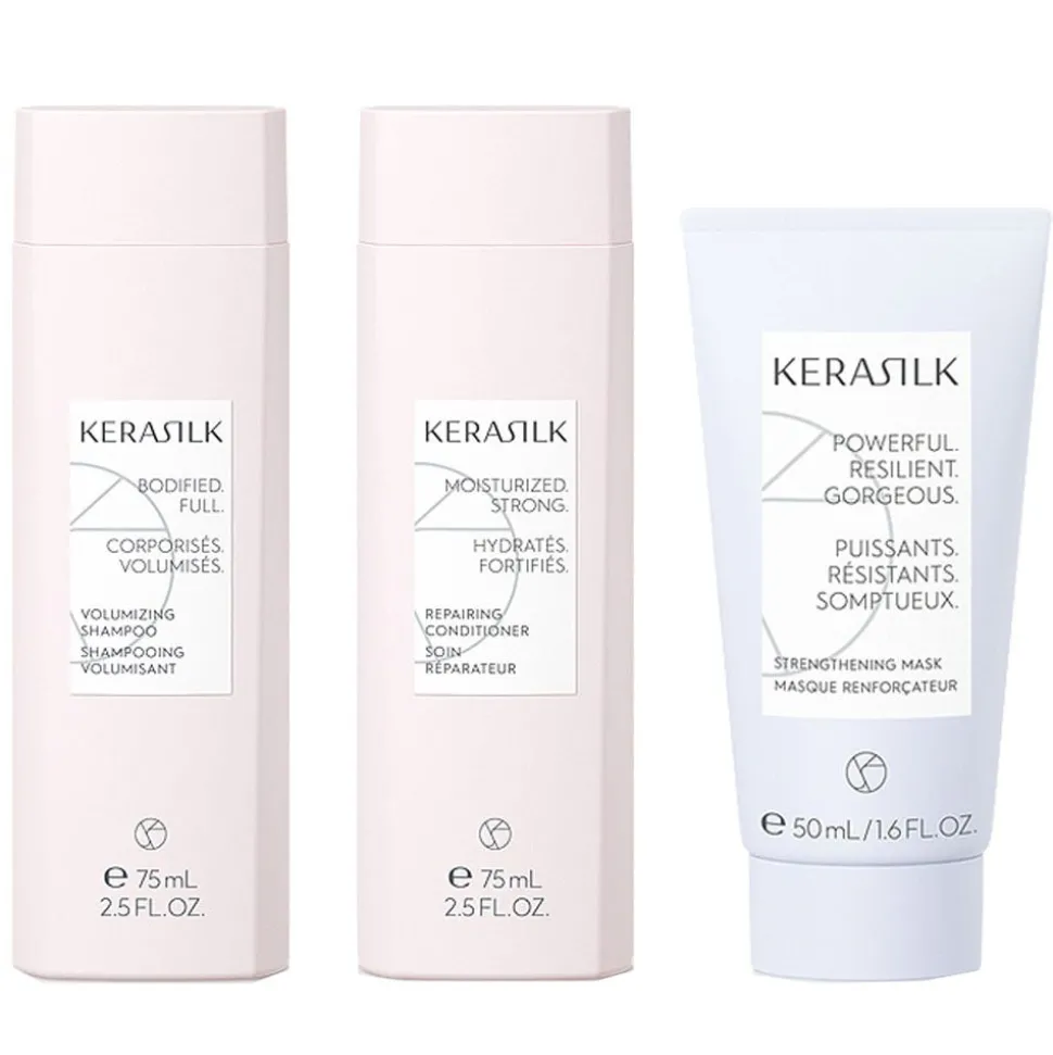DasKerasilk Reparatur Hero Kennenlern-Set eignet sich perfekt für geschädigtes Haar. Enthalten ist dasKerasilk Reparierendes Shampoo 75 ml, derKerasilk Reparierender Conditioner 75 ml und dieKerasilk Recovery Mask 50 ml.
