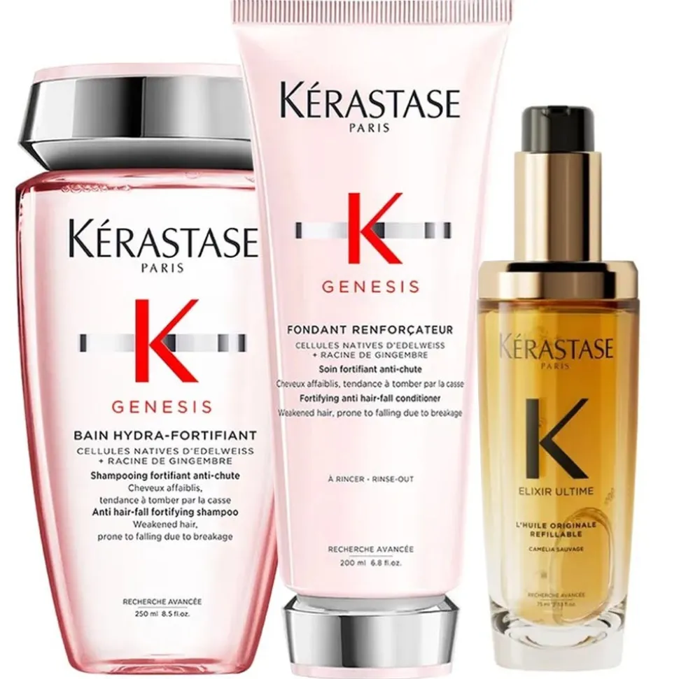 Das Kérastase Genesis Hydra Bundle kräftigt und pflegt feines Haar ideal. Das 3-teilige Haarpflege-Set ist zusammengesetzt aus einem sanft reinigendem Shampoo, einem versiegelnden Conditioner und einem nährendem Haaröl für glänzende Ergebnisse.