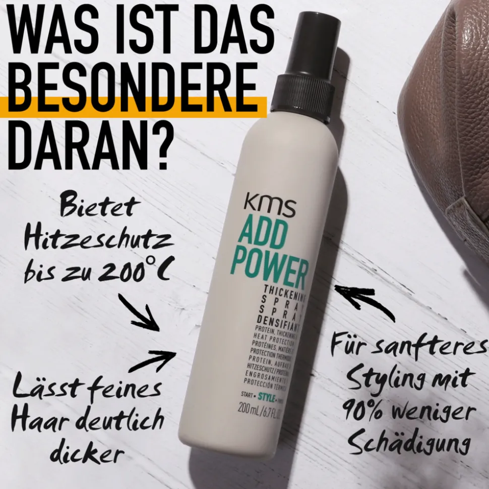 Das KMS Addpower Thickening Spraylässt feines Haar deutlich dicker aussehen und anfühlen. Für sanfteres Styling mit 90% weniger Schädigung. Bietet Hitzeschutz bis zu 200°C.
