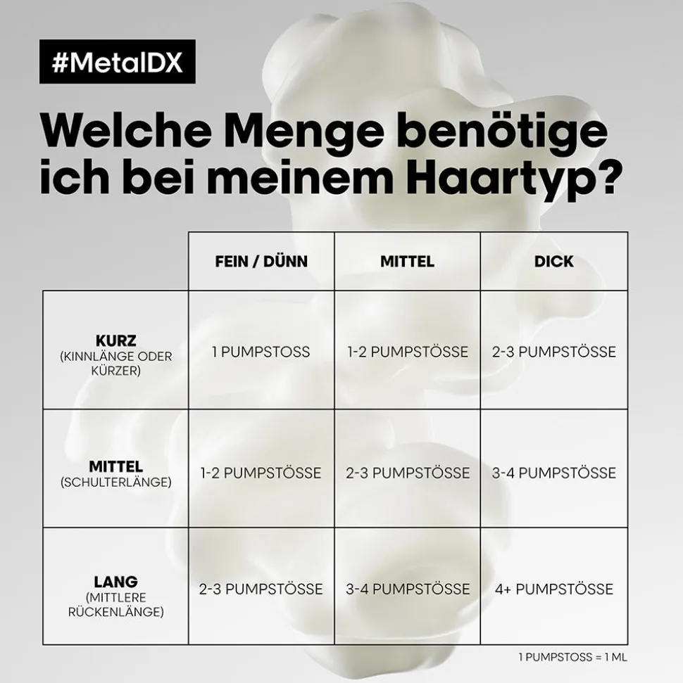 Die L’Oréal Professionnel Paris Serie Expert Metal DX High Protection Cream wurde für alle Haartypen entwickelt. Sie ist die perfekte Ergänzung der Metal DX Routine. Angereichert mit Glicoamin zieht die zartschmelzende, feuchtigkeitsspendende Textur sofort ein und umhüllt die Haarfaser, ohne das Haar zu beschweren. Die Cream sorgt für langanhaltende Frizz-Kontrolle, macht das Haar weicher, geschmeidiger und leichter stylbar (nach Anwendung der Metal DX Routine). Das Haar ist glänzender und die Farbe hält länger. 97% der Farbbrillanz bleiben nach 8 Wochen erhalten. Mit UV-Filter: schützt das Haar vor UV-induzierten Schäden und Oxidation, Bürsten und Hitze bis 230°C.