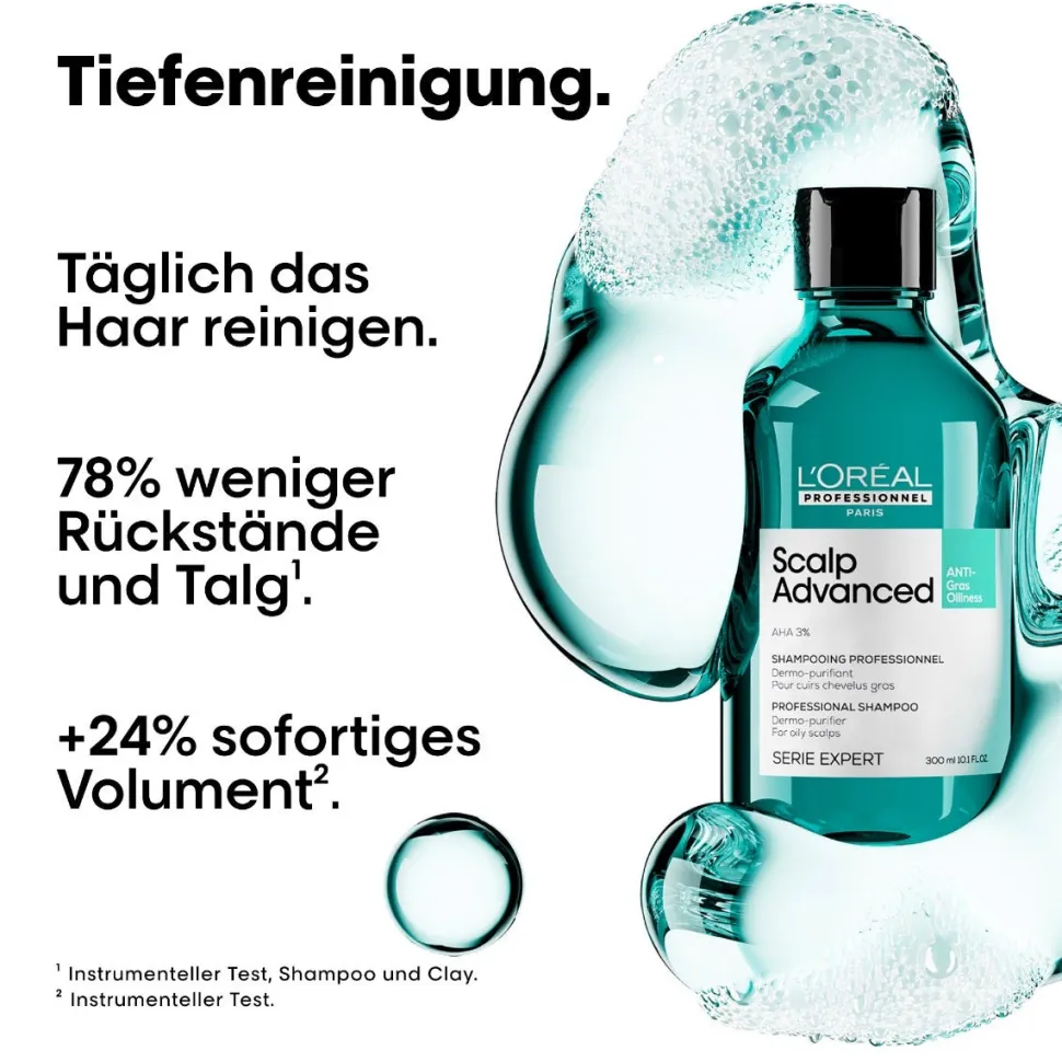 DasL’Oréal Professionnel Paris Série Expert Scalp Advanced Anti-Oiliness Dermo-Purifier Shampoowurde speziell für ölige Kopfhaut entwickelt. Die Kopfhaut wird intensiv gereinigt. Bereits nach der ersten Anwendung werden Rückstände und Talg auf der Kopfhaut um 78% reduziert.