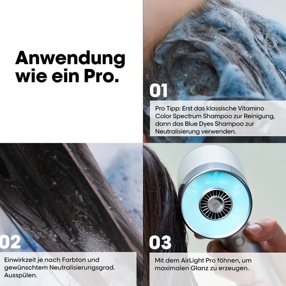 - Pro-Tipp: Zuerst ein reguläres Shampoo verwenden, um Rückstände zu entfernen. Danach erneut mit einem neutralisierenden Shampoo waschen. Das Shampooo entsprechend der Haarfarbe wählen: Purple Dyes für blondes, Blue Dyes für hellbraunes & Green Dyes für dunkelbraunes Haar.