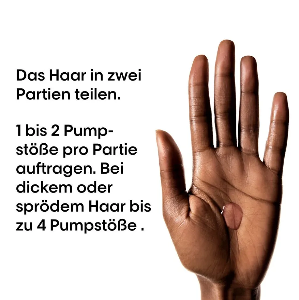 - 1-2 Pumpstöße für dünnes bis mittleres Haar, 3-4 Pumpstöße für dickeres Haar.