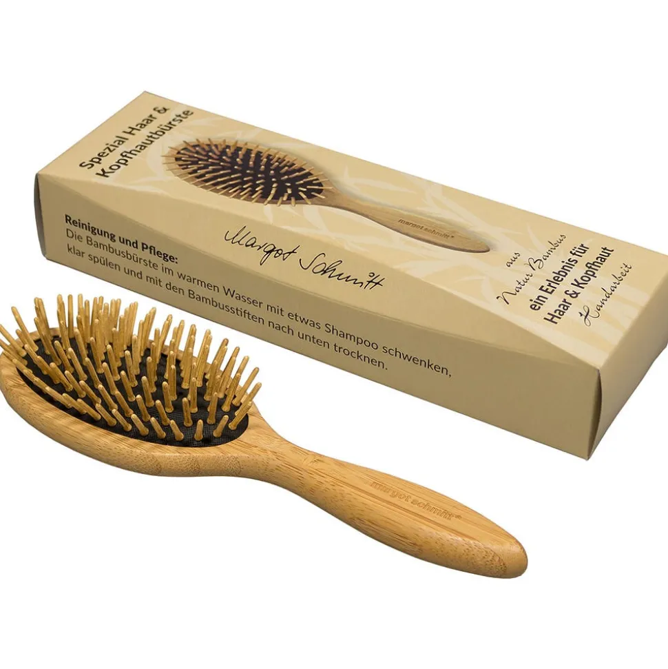 Die Margot Schmitt Pneumassagebürsten sind eine Wohltat für Haar und Kopfhaut. Die abgerundeten Spezialborsten aus Bambus massieren in Kombination mit dem Luftkissen sanft die Kopfhaut und fördern die Durchblutung. Die Bambusborsten (Stifte) sind zusätzlich mit Bienenwachs behandeln, sodass sie schon beim Kämmen besonders sanft zum Haar sind.
