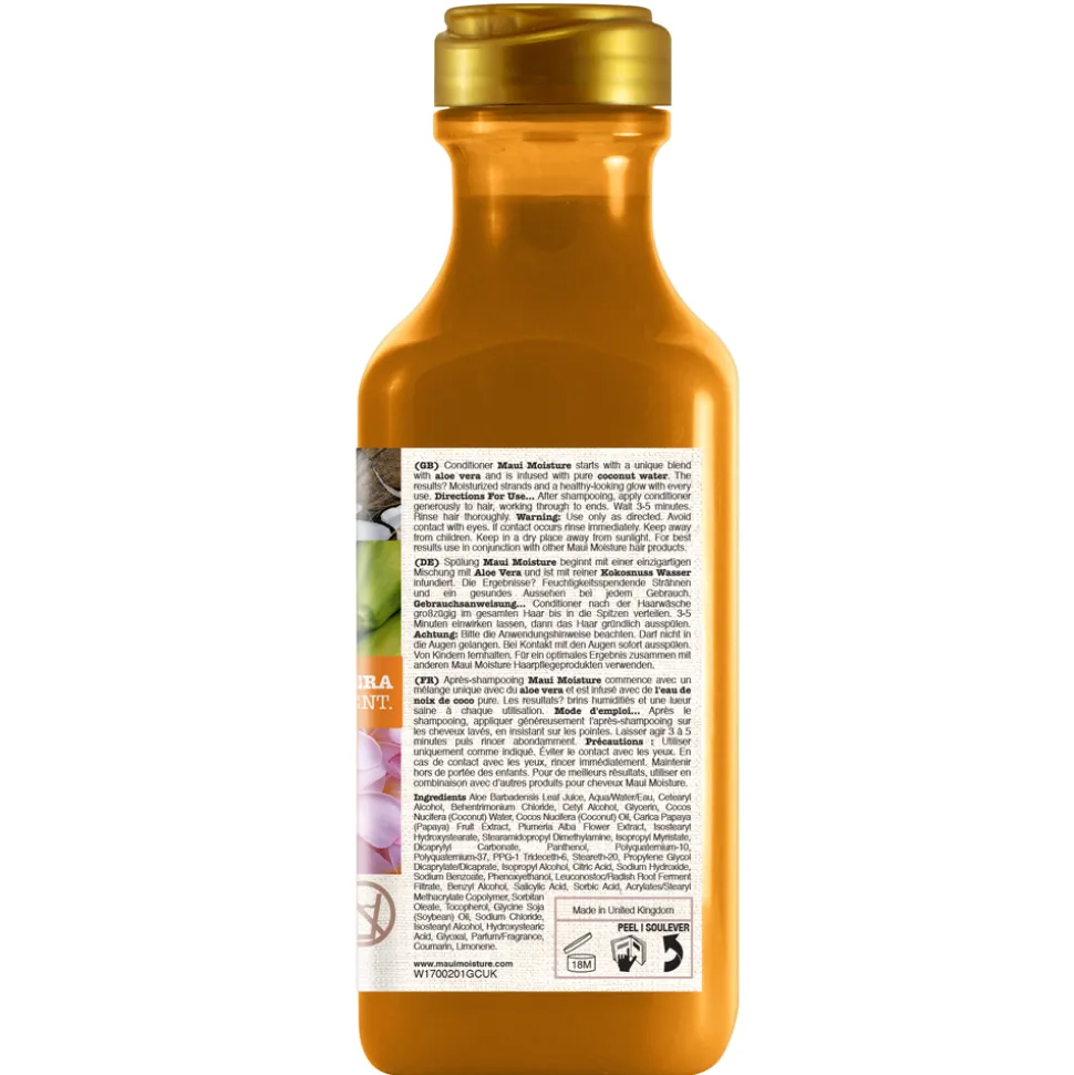 | Inhaltsstoffe | Aloe Barbadensis Leaf Juice, Aqua, Water, Eau, Cetearyl Alcohol, Behentrimonium Chloride, Cetyl Alcohol, Glycerin, Isostearyl Hydroxystearate, Cocos Nucifera (Coconut) Water, Cocos Nucifera (Coconut) Oil, Carica Papaya (Papaya) Fruit Extract, Plumeria Alba Flower Extract, Panthenol, Polyquaternium-10, Polyquaternium-37, Stearamidopropyl Dimethylamine, Steareth-20, Dicaprylyl Carbonate, Propylene Glycol Dicaprylate, Dicaprate, PPG-1 Trideceth-6, Acrylates Copolymer, Sorbitan Oleate, Isopropyl Alcohol, Isopropyl Myristate, Citric Acid, Sodium Hydroxide, Sodium Benzoate, Glycine Soja (Soybean) Oil, Phenoxyethanol, Tocopherol, Salicylic Acid, Sorbic Acid, Benzyl Alcohol, Leuconostoc, Radish Root Ferment Filtrate, Parfum, Fragrance, Limonene, Coumarin |