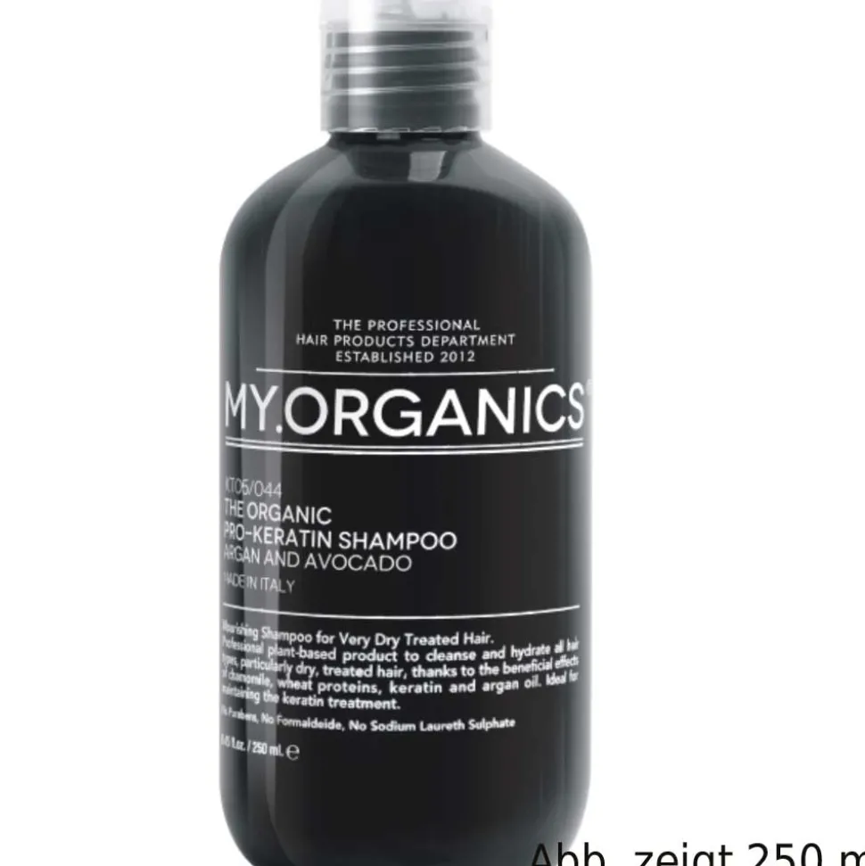 Das My.Organics My Pro-Keratin Shampoo mit pH 5.0-5.5 ist ein pflegendes Argan- und Avocado-Shampoo für sehr trockenes und coloriertes Haar. Ein professionelles pflanzliches Produkt, das durch Kamille und Weizenproteine reinigt und das Haar mit Feuchtigkeit versorgt. Eine sorgfältige Mischung aus Vitaminen regeneriert und bietet intensive Nahrung für strapaziertes Haar. Seidenextrakte und hochwertige ätherische Öle machen das Haar samtweich. Ideal für die Aufrechterhaltung der Keratin-Behandlung.