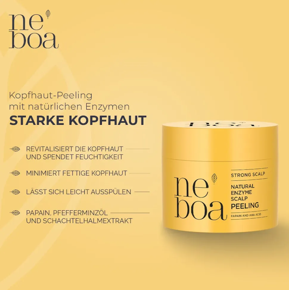 Das neboa Scalp Renew Natural Enzyme Scrub reinigt, belebt und erfrischt die Kopfhaut. Das enthaltende Pfefferminzöl und Ackerschachtelhalm-Extrakt regt die Mikrozirkulation an, wodurch Haarausfall gehemmt und das Haarwachstum sichtbar beschleunigt wird. Ein Postbiotikum unterstützt das natürliche Mikrobiom der Kopfhaut. Die vegane Formulierung wirkt beruhigend, hydratisiert die Kopfhaut und minimiert die Schuppenbildung.