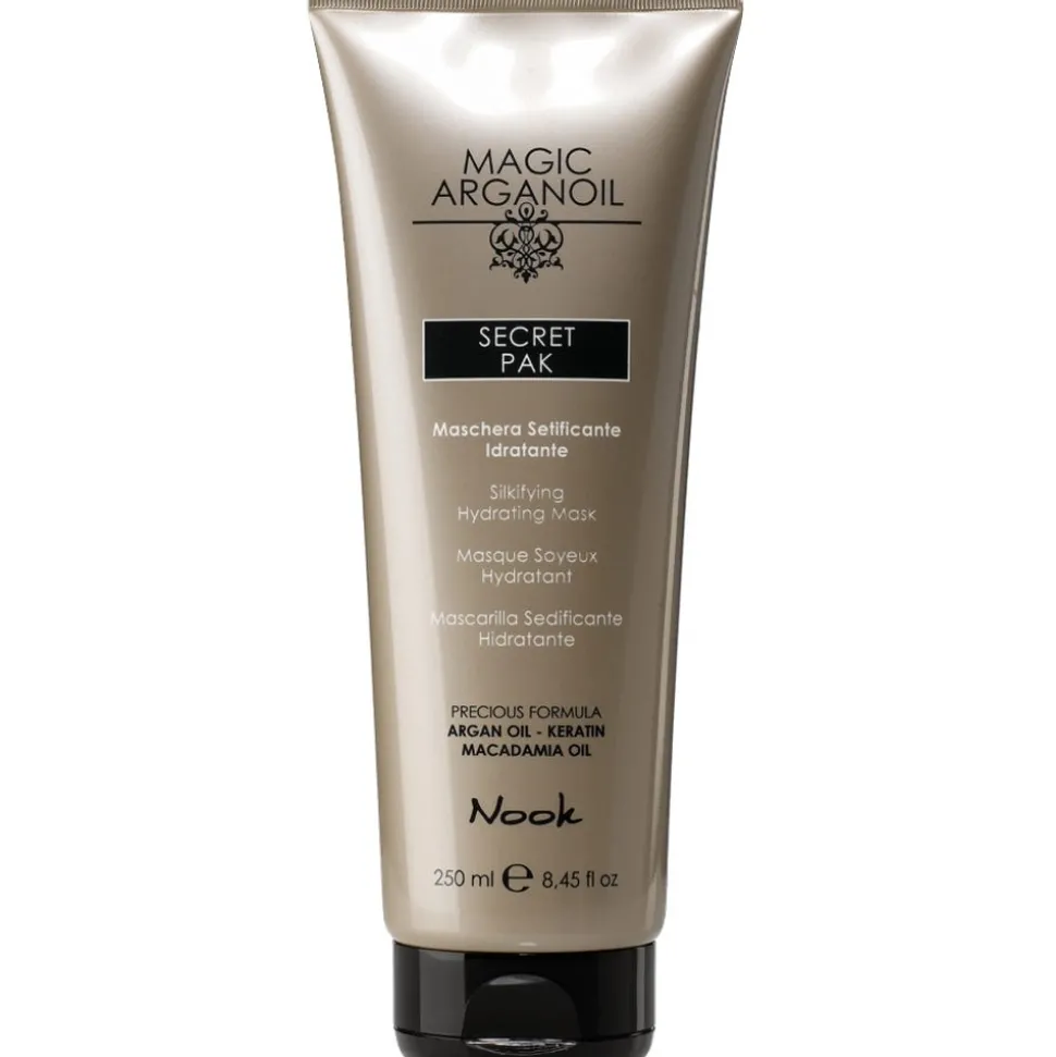 DieNook Magic Argan Oil Secret Pak Seidenglanz-Haarmaske eignet sich besonders gut für trockenes und strapaziertes Haar. Mit zertifiziertem Bio-Arganöl, Macadamiaölund Keratin, ideal für sehr trockenes und strapaziertesHaar und durch chemische Behandlungen beanspruchtesHaar. Sie verspricht intensive Pflege, ohne das Haar zubeschweren. Für glänzendes, seidenweiches Haar mitSpannkraft.