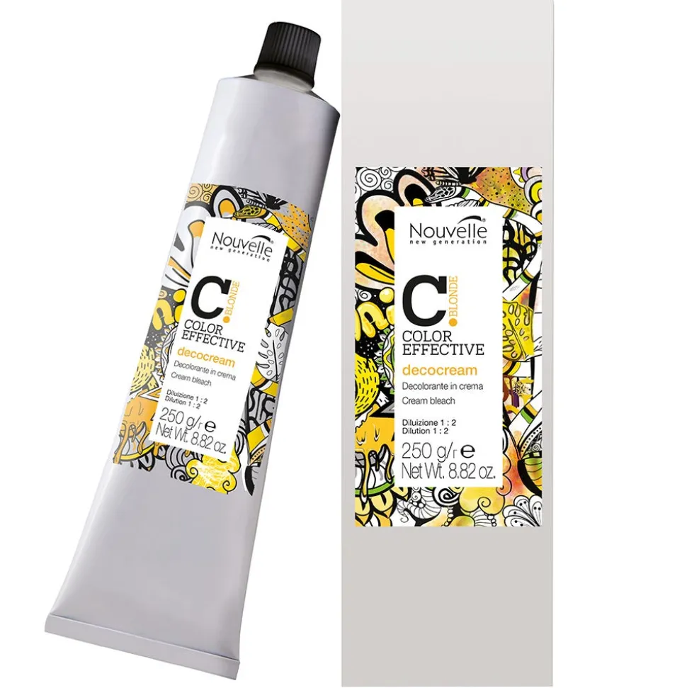 DieNouvelle Deco Cream Blondiercreme Color Effectsorgt für eine Aufhellung bis zu 5 Tonstufen bei einem Mischverhältnis von 1:2. Die Blondiercreme besitzt eine Formel aus wertvollen natürlichen Ölen und einen besonders niedrigen Ammoniakgehalt.