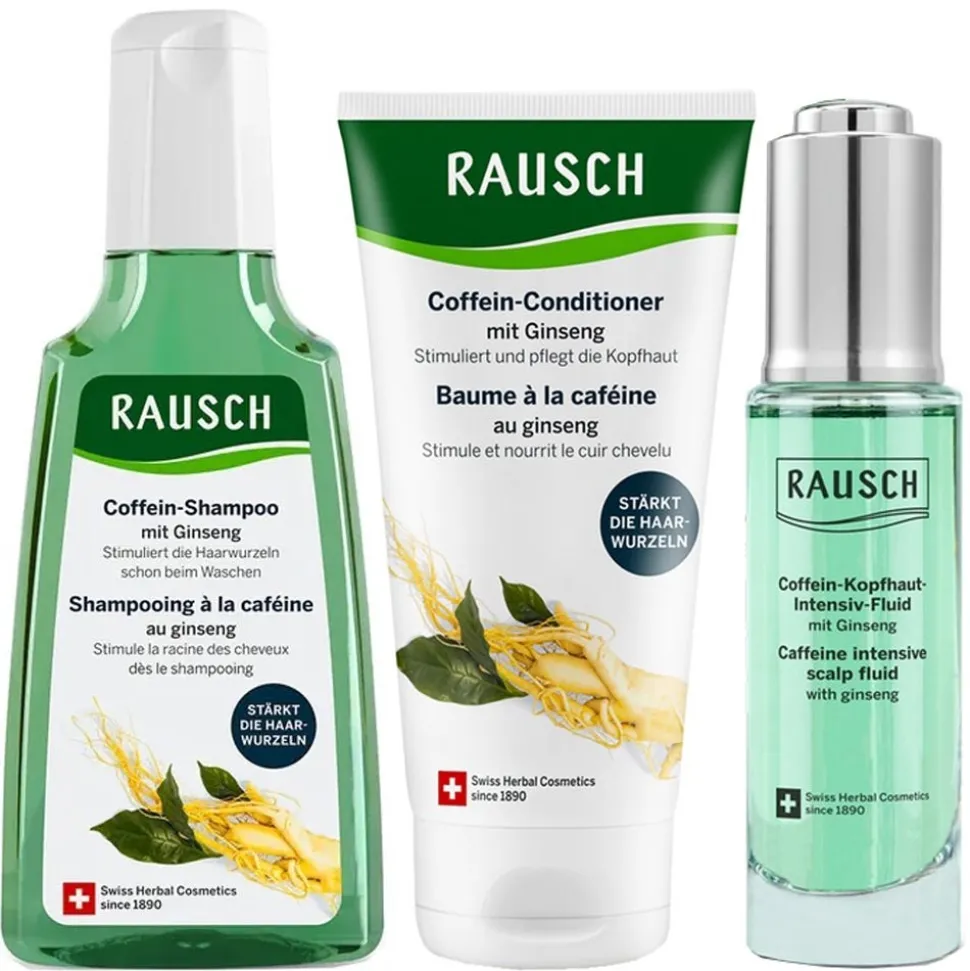 Das Rausch Ginseng Coffein Set bei Haarausfall Bundle ist ein 3-teiliges Haarpflege-Set, das mit Koffein angereichert ist und bei Haarausfall hilft. Das Set ist zusammengesetzt aus einem sanft reinigendem Shampoo, einem pflegenden Conditiioner und einem Koffein-Serum für die Kopfhaut.