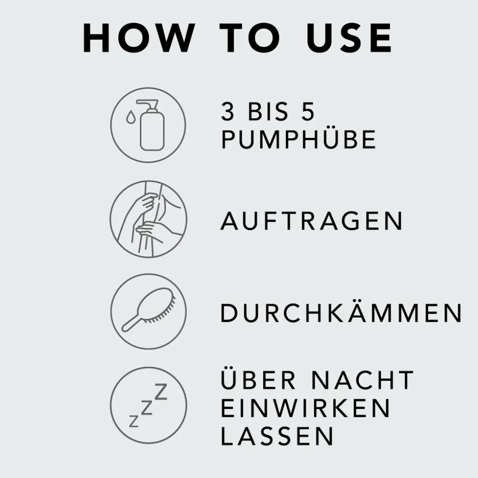 Über Nacht anwenden. 3 bis 5 Pumpstöße in die Handfläche geben und im trockenen oder feuchten Haar verteilen. Nicht ausspülen. Morgens wie gewohnt stylen. Täglich anwendbar.