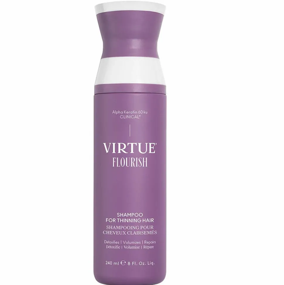 DasVirtue Flourish Shampoo for Thinning Hairfür dünner werdendes Haar entfernt sanft Kopfhautablagerungen, reinigt den Haarschaft und entfernt Ablagerungen aus den Follikelöffnungen, wodurch eine Umgebung für gesundes Wachstum geschaffen wird.