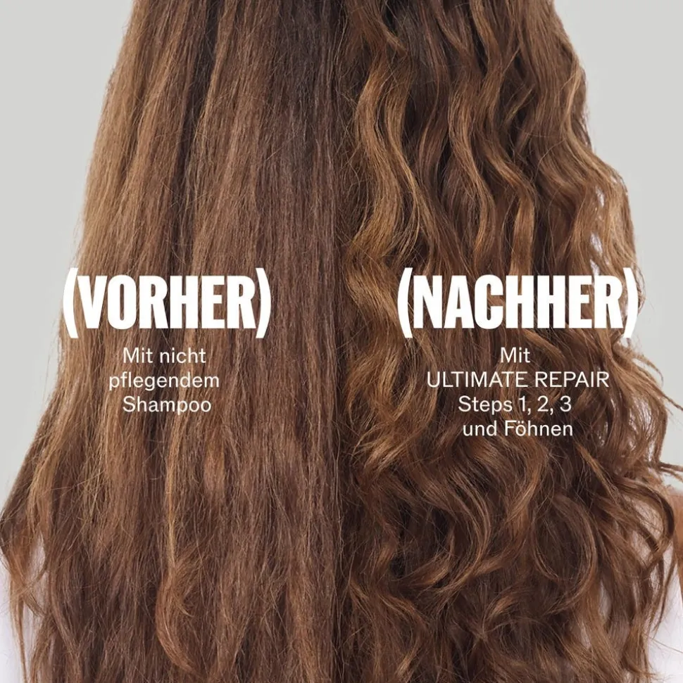 - Step 1:Reinigen & vorbereiten– Das Haar wird mit dem Ultimate Repair Shampoo gereinigt und auf die Pflegeroutine vorbereitet.Das Creme-Shampoo mit Metal Purifier Technologie befreit die Haare von Metallen, Verunreinigungen und Schadstoffen. Um das Shampoo leichter einzuarbeiten, das trockene Haar vorab bürsten. Anschließend das Shampoo im nassen Haar aufemulgieren und von der Kopfhaut bis in die Haarspitzen verteilen. Die Anwendung kann ruhig wiederholt werden, denn hier gilt: lieber zweimal mit einer kleineren Menge shampoonieren als einmal mit mehr Produkt.
